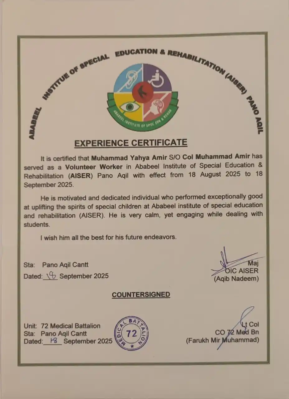 Giving back to society is a core value for me. I have actively participated in flood relief operations in Sindh, supporting affected families, and conducted a motivational workshop for special children, fostering confidence and inclusion. These experiences have shaped my outlook on leadership, empathy, and social responsibility, values I aim to uphold throughout my professional journey.